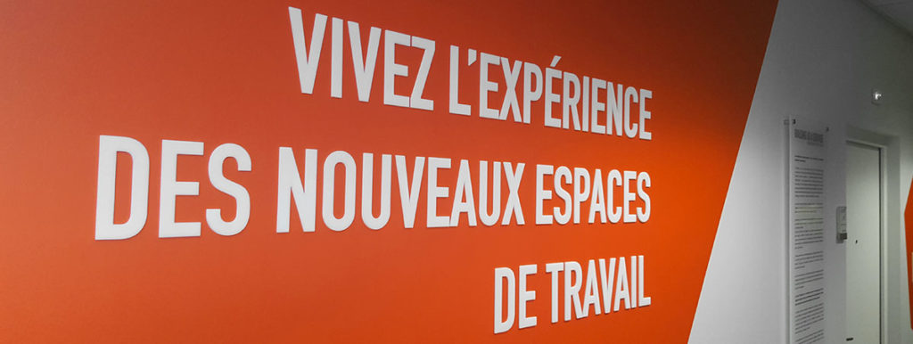 Matériaux utilisés pour ce projet de décoration de bureaux : impression avec encres écologiques sur adhésifs, découpe de lettrages en relief sur plexiglass, impression de signalétique sur panneau.