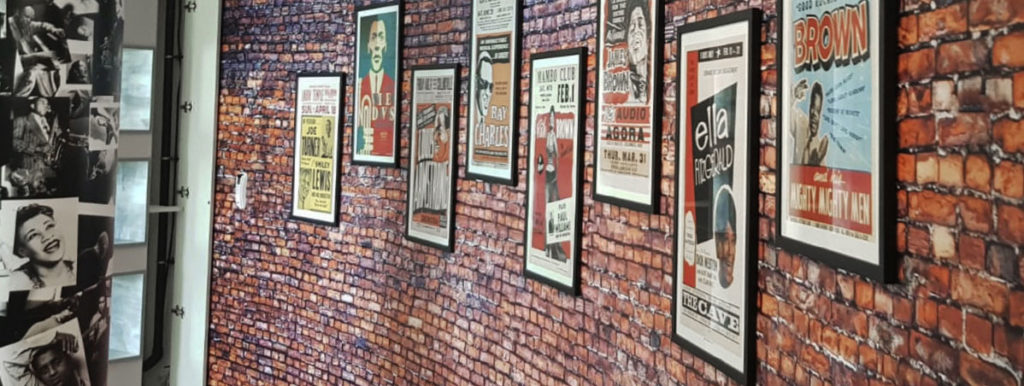Adhésifs muraux : création de visuels issus des textes les plus connus du Jazz, impression sur adhésif et contre collage de lettres en PVC. Création et impressions avec encres écologiques de murs en trompe-l’œil de briques style New York. Ces adhésifs muraux ont été laminés avec un adhésif mat leur permettant ainsi de les protéger et d’être lessivés à volonté.