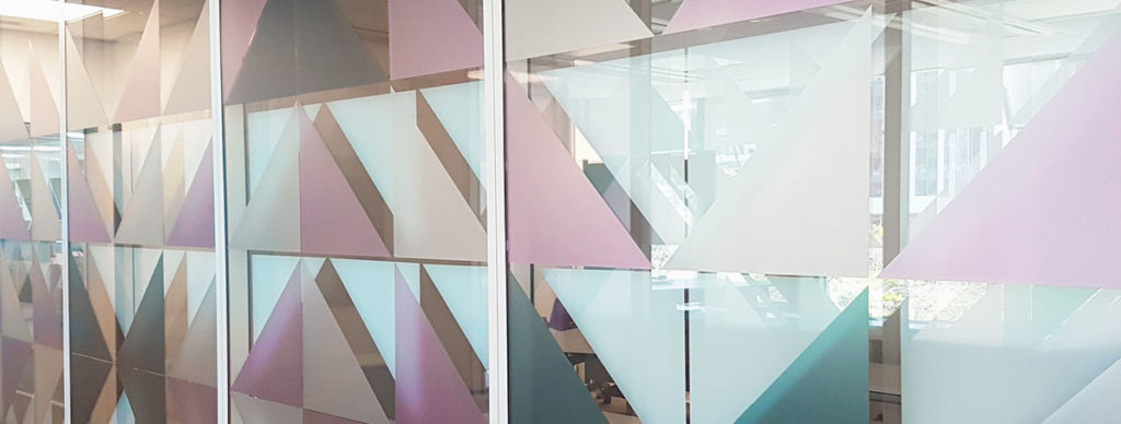 Afin d’apporter de la profondeur aux motifs de cette vitrophanie, nous avons réalisé la pose en deux étapes. Nous avons réalisé la pose des triangles blancs sur le côté intérieur des vitres des bureaux. Puis, nous avons posé les triangles de couleurs côté extérieur des vitres. Cette technique de pose nous a permis d’obtenir un résultat unique : l’accumulation des deux motifs par transparence donne du relief aux vitres.
