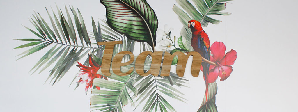 Les créations : afin de respecter la thématique d’une décoration tropicale souhaitée par notre client, nos graphistes ont imaginé un décor sur mesure pour ces bureaux.