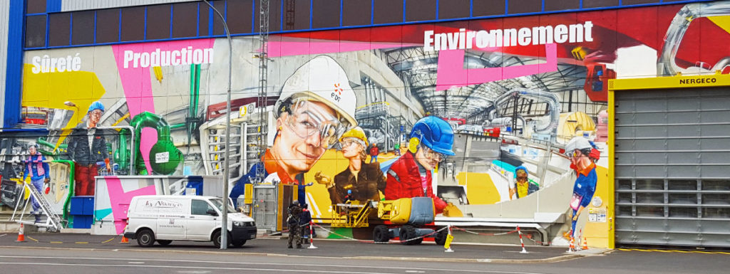 Création d’une fresque géante de plus de 80 mètres en graffiti pour la société EDF reprenant des thématiques et valeurs propres à la société afin d’ habiller un mur géant, ainsi que d’apporter de la couleur sur un site où les murs gris sont prédominants.