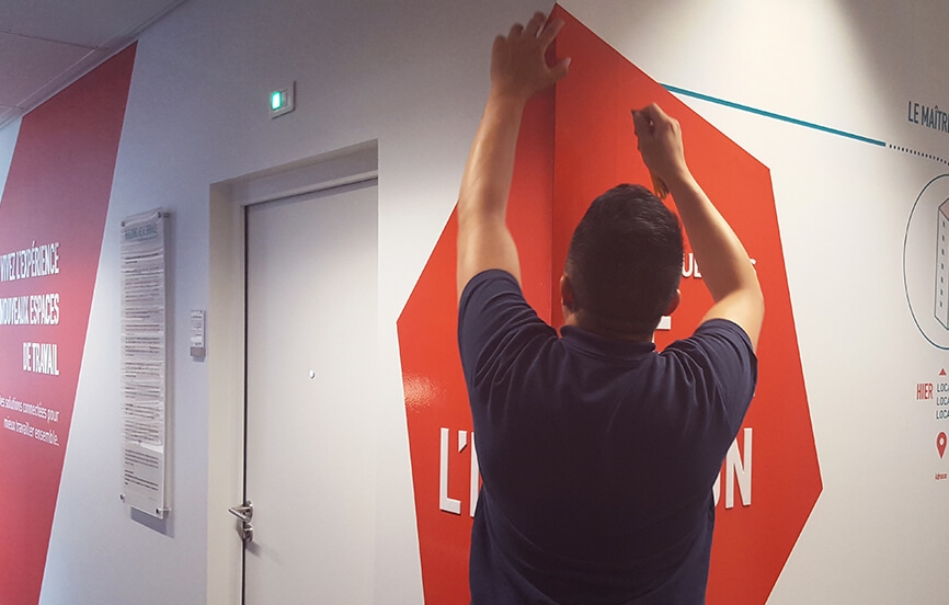 Pose définition : la pose de films adhésifs revient à installer un adhésif sur un support (surface vitrée, murs, sol, etc.).